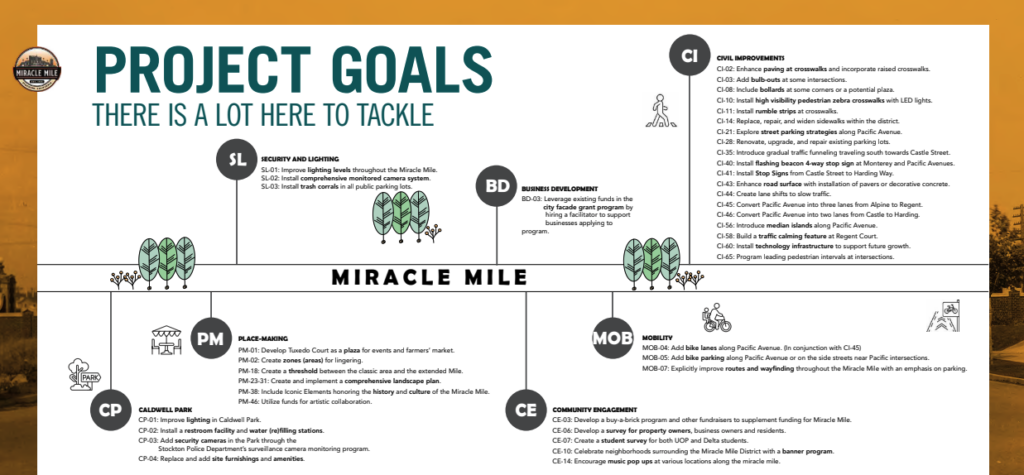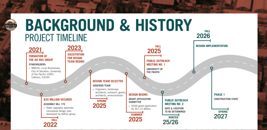In 2022, Assembly Bill 179 granted $20,000,000 to the City of Stockton for pedestrian crossing upgrades, public safety improvements, and revitalization of the Miracle Mile.
